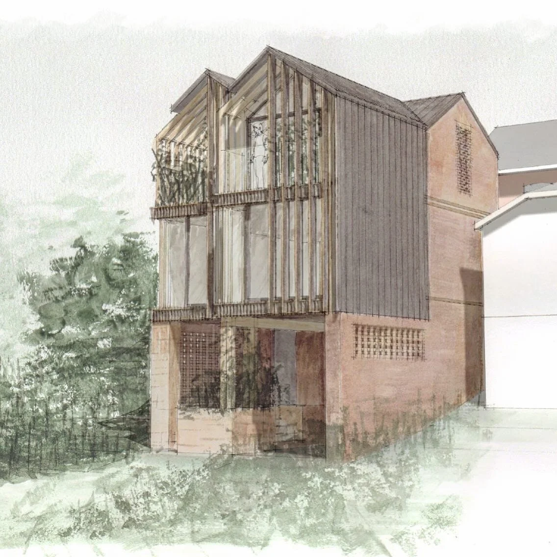 The careful location and scale of openings optimally balances solar orientation, views out and privacy. The predominant use of brick and gestural use of the metal roofing wrapping down the north-corner enhances the concept of the building being ‘closed’ to this orientation. The generous use of glass on the south corner is gestural of the building ‘opening up’ to this aspect. The locally grown and milled chestnut louvres and cladding prevent overlooking and loss of privacy for the occupants and neighbours, whilst also preventing overheating from the harshest direct south sunlight.